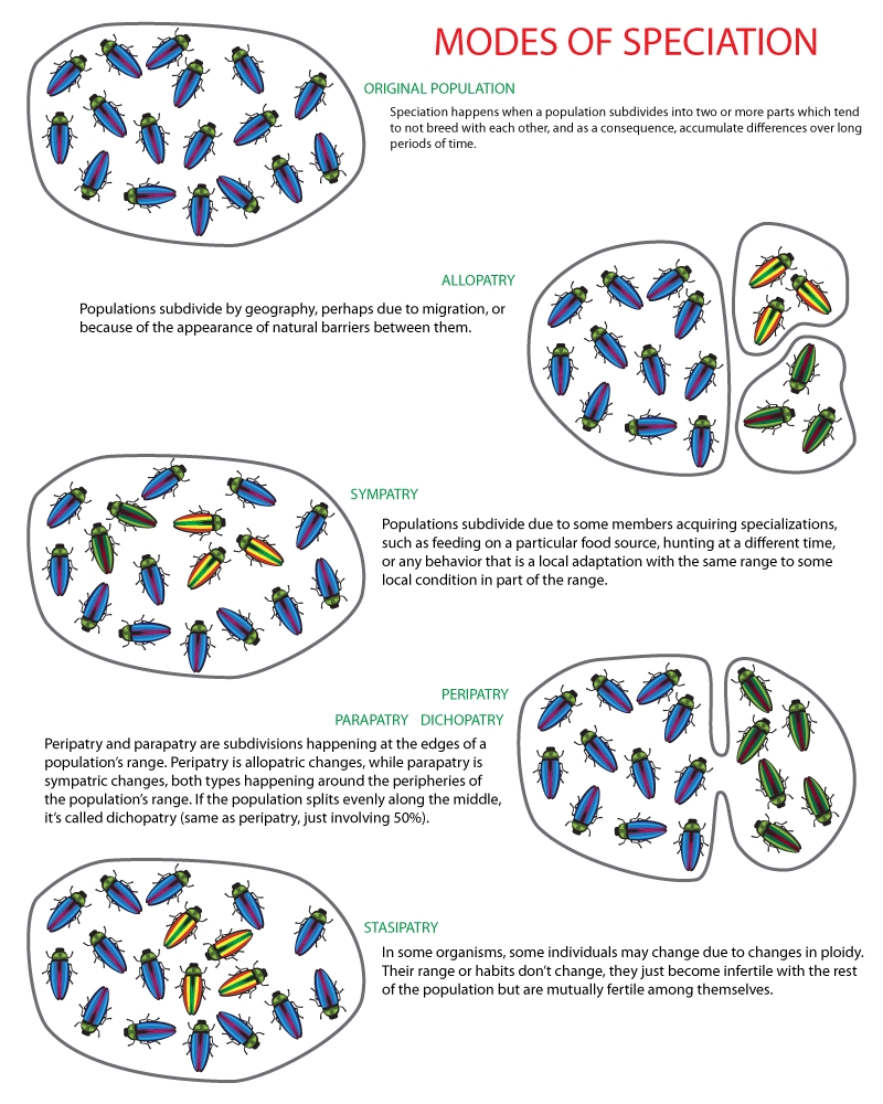 These are similar to allopatry and sympatry, respectively. Peripatry is like allopatry in that there is geographical isolation, but there is no geographic barrier as such. Instead, it happens along the periphery (hence peri-patry) of the population's range. Typically, population density is greater near the center and drops off towards the periphery. So gene flow might be very high among parts of the population near the center, but quite low at the periphery. In such cases, differences may develop between subpopulations at the center and at the periphery, leading to eventual speciation.