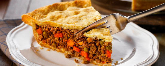 - Tourtiere – este o placinta de carne servita in zona Quebec si consta dintr-un amestec de carne tocata marunt de porc, vitel sau de vita, alaturi de telina taiata marunt si acoperita cu o crusta de coca; se face apoi la cuptor, la foc mic;