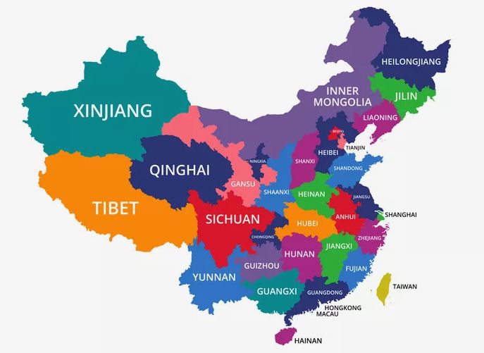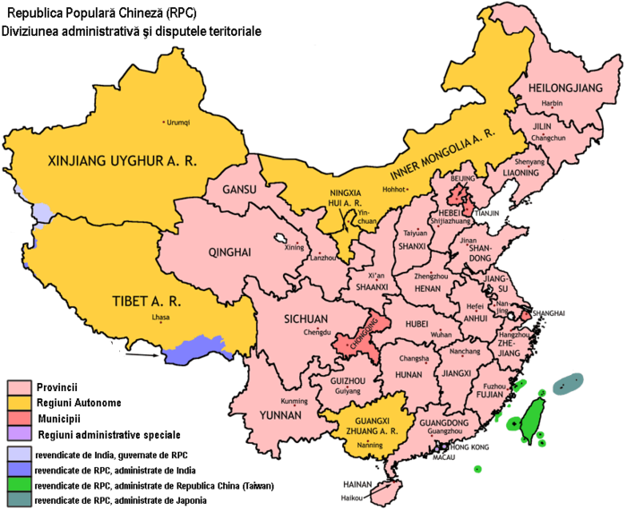 Republica Populară Chineză este compusă din 22 de provincii. Pe lîngă aceste provincii, există 5 regiuni autonome, fiecare desemnată pentru anumite grupuri minoritare, 4 municipii (regiuni municipale), și două regiuni autonome cu statut special, care se bucură de o autonomie mai extinsă. Cele sus numite sînt referita ca "China continentală", denumire ce include Hong Kong și Macau.