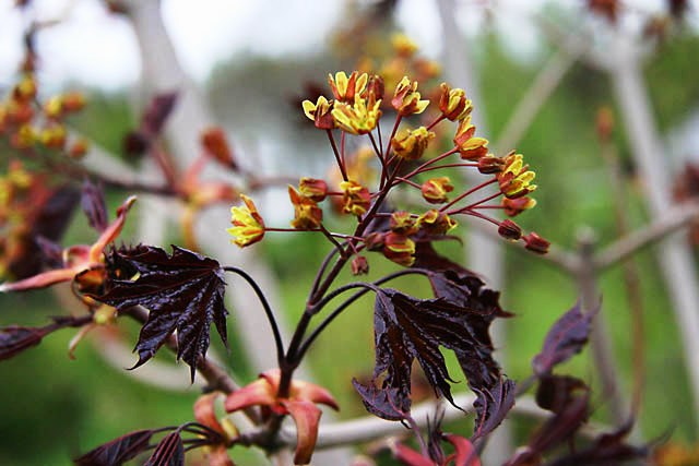 Flori: corimbe erecte, pedunculi, stigma si sepalele sunt de un rosu inchis stralucitor care contrasteaza foarte frumos cu petalele si staminele galbene.