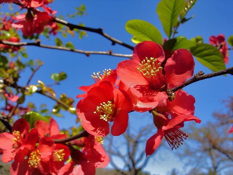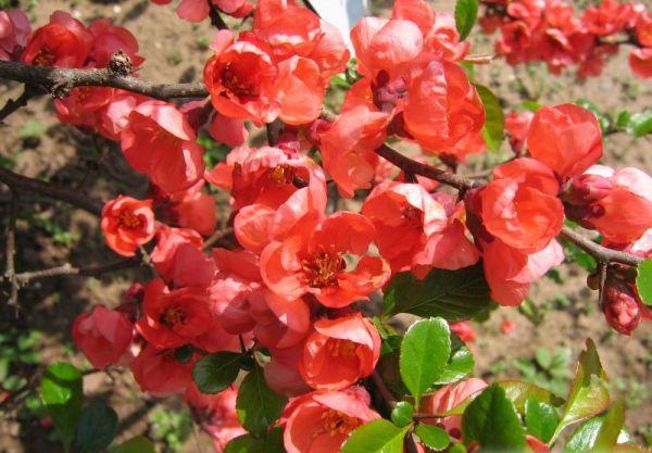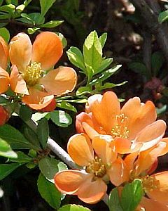 The Japanese quince is invaluable for early spring colour when its bright orange-flame flowers stud the bare thorny stems for weeks. These flowers often mature into rounded green or yellow quinces which can make an delicious jelly. It's one of the easiest of all shrubs to grow in virtually any soil and can also be trained onto a shady wall.