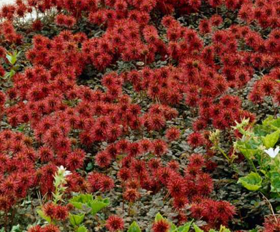 Florile au forma sferica, spinoase de culoare rosie-aramiu.