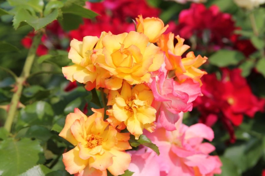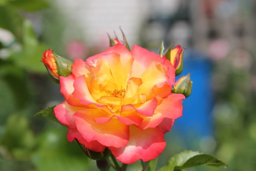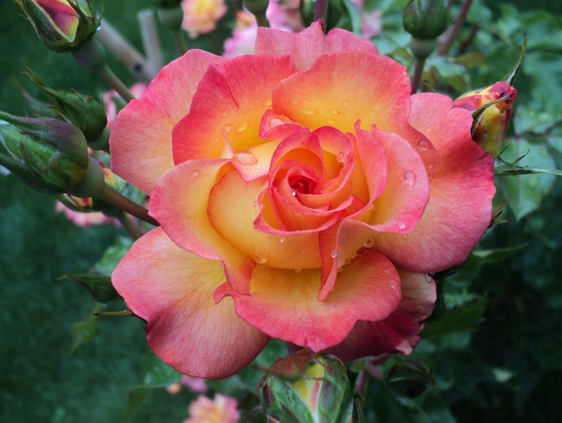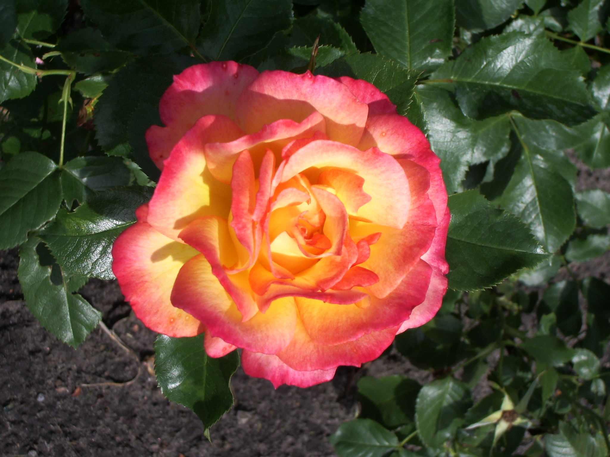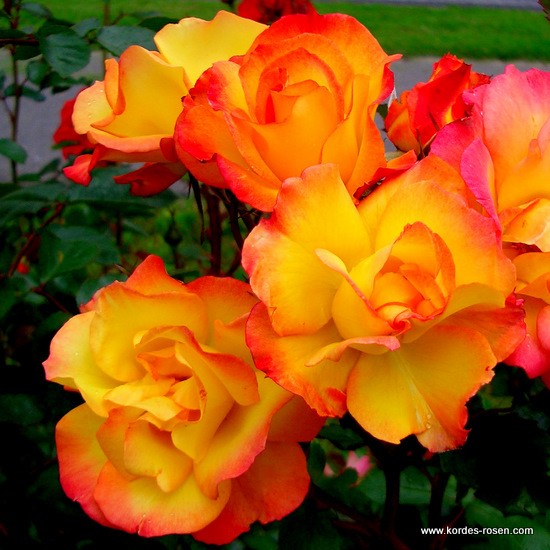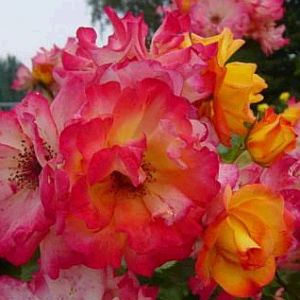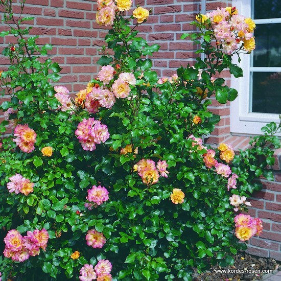 Tufa deasa, cu ramuri grele, ce cresc viguros, drept sau arcuit, pana la 2,5 m. O culoare minunata. Petalele sunt de un galben-viu, avand marginile rosii ce devin rosii-vermilion pana la rosu-maroniu, pe masura maturizarii florii. Rezistenta buna la boli. Poate fi dirijat si ca urcator.