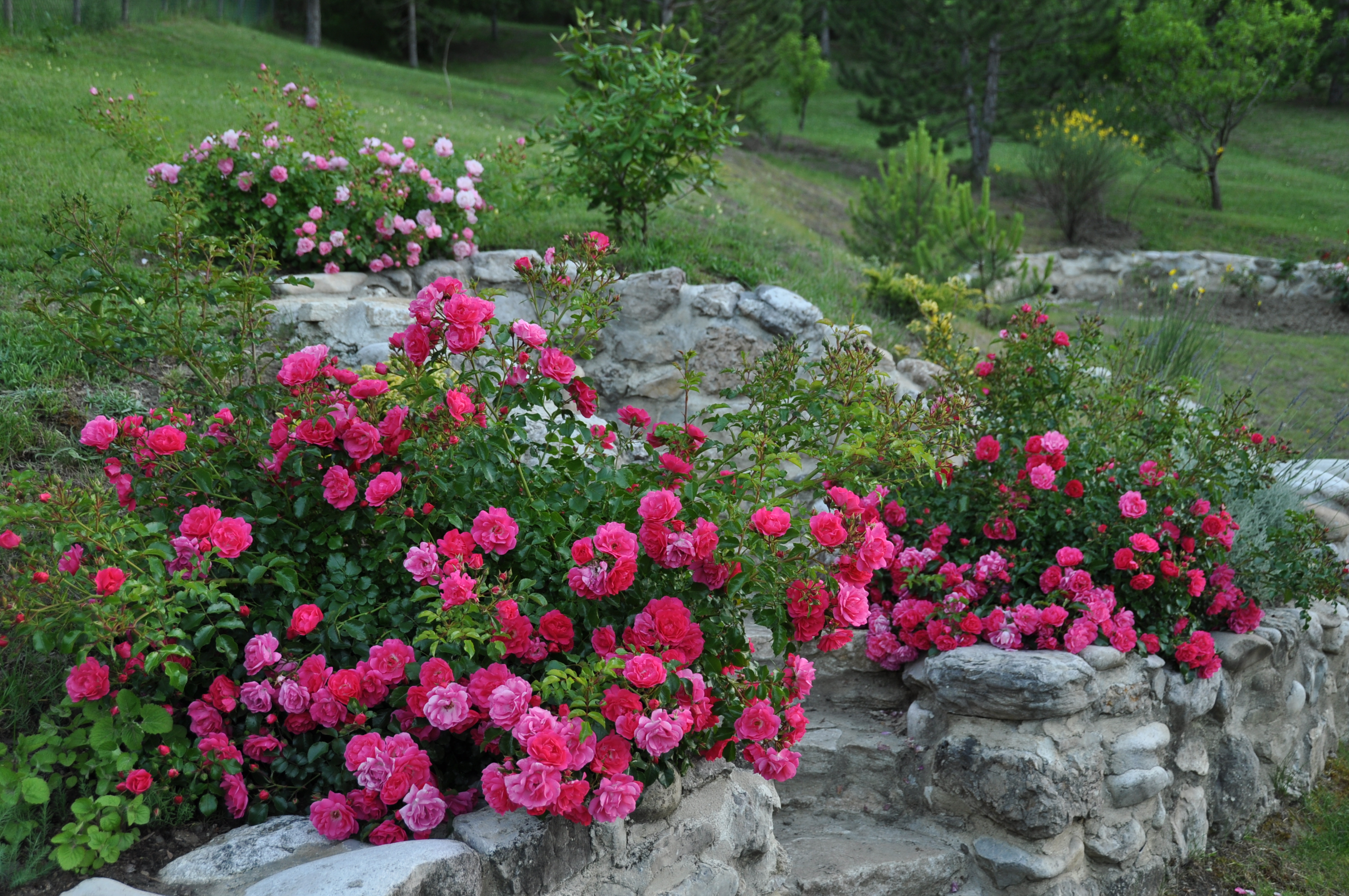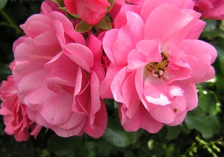 Flori:roz carmin, semi-duble, rezista pana toamna.