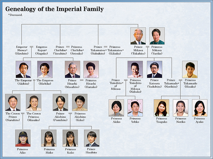 Conform Legii Familiei Imperiale din 1947, sunt considerați membri ai familiei imperiale: Împăratul Japoniei; Împărăteasa; Împărăteasa-Mamă; Împărăteasa-Bunică; Prințul moștenitor și consoarta sa; nepotul imperial care este moștenitor prezumptiv şi consoarta sa; ceilalți nepoți și consoartele lor; nepoatele nemăritate pe linie paternă; prinții imperiali și consoartele; și prințesele imperiale. Copii legitimi și nepoții/nepoatele pe linie paternă ai Împăratului sunt „prinți imperiali” în cazul bărbaților, și „prințese imperiale” în cazul femeilor. Descendenți mai îndepărtați masculini sunt numiți „prinț”, iar pentru descendenți de sex feminin „prințesă”.