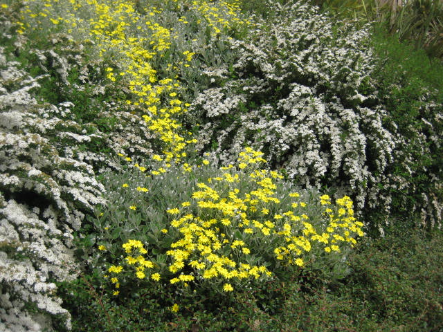 Florile sunt asemeni margaretelor, petalele fiind ca niste raze galbene cu discuri in centru, dispuse in panicule. Abundenta florilor au tendinta de a acoperi literalmente intreaga tufa.