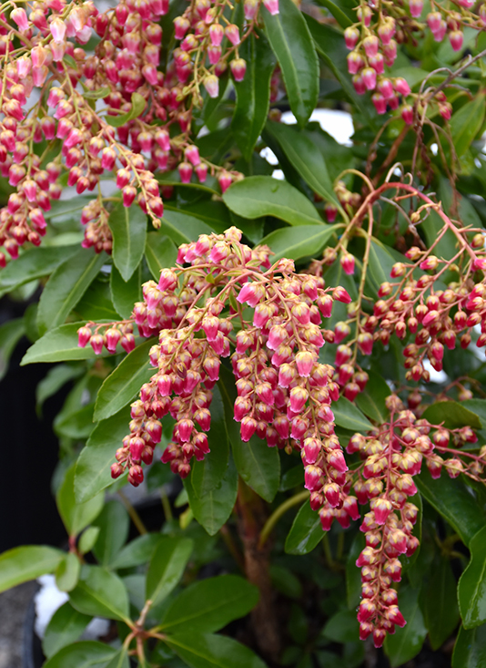 Flori :rosu inchis, in panicule pendule, 12-15 cm lungime si 14 cm largime. Perioada de inflorire din mijlocul lui martie pana in aprilie/mai.